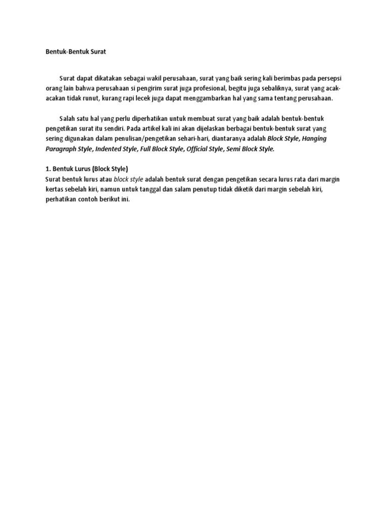 Untuk baris berikutnya, tulisan menjorok lima hentakan dari margin kiri. Contoh bentuk surat resmi setengah lurus bentuk setengah lurus semi block style bentuk lekuk indented style bentuk alinea menggantung hanging style bentuk resmi official style bentuk surat. Hal ini memerlukan waktu yang cukup lama sehingga dianggap tidak praktis. Pada bentuk surat menggantung atau hanging paragraph style se tiap alinea nya memang berbentuk menggantung. 5.bentuk menggantung (hanging paragraph), sebenarnya juga sama dengan surat bentuk lurus, perbedaannya hanya pada penukisan alamat dan alineanya.